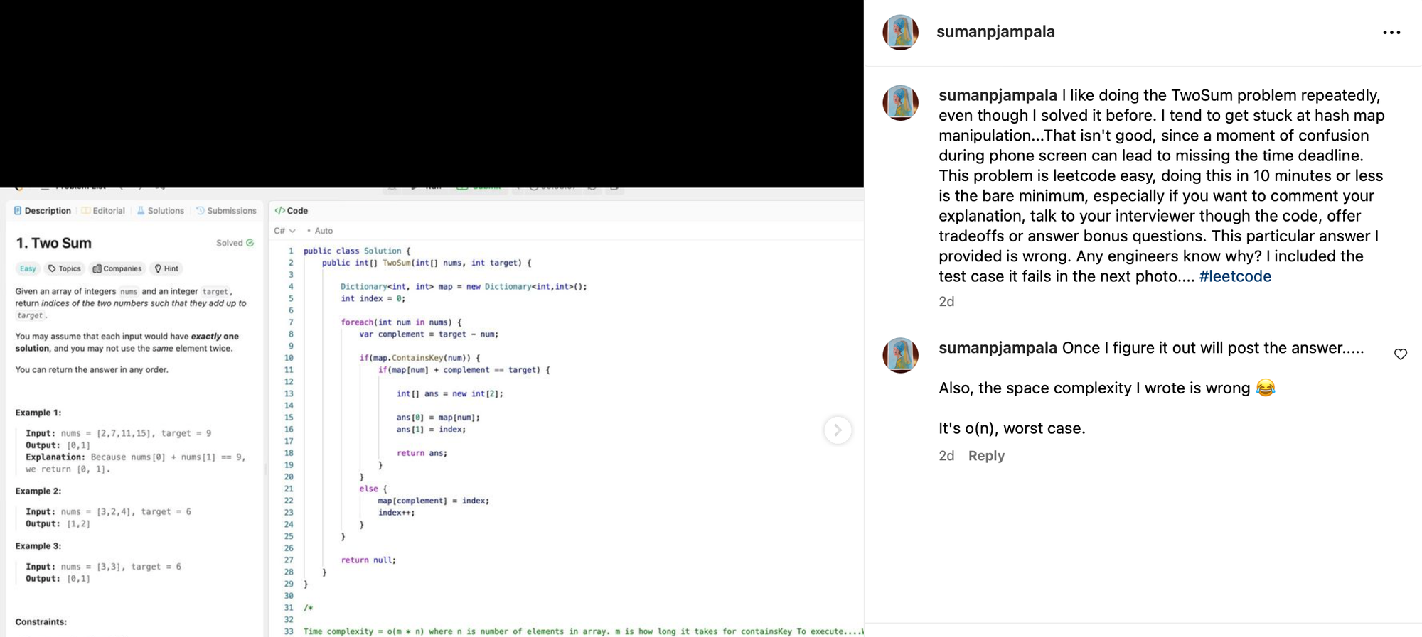A couple of days ago, I posted my attempt of the solution, asking if anyone knows the problem with my code. Link here - takes you to my instagram page. Screenshots here for those who don't have an instagram page.