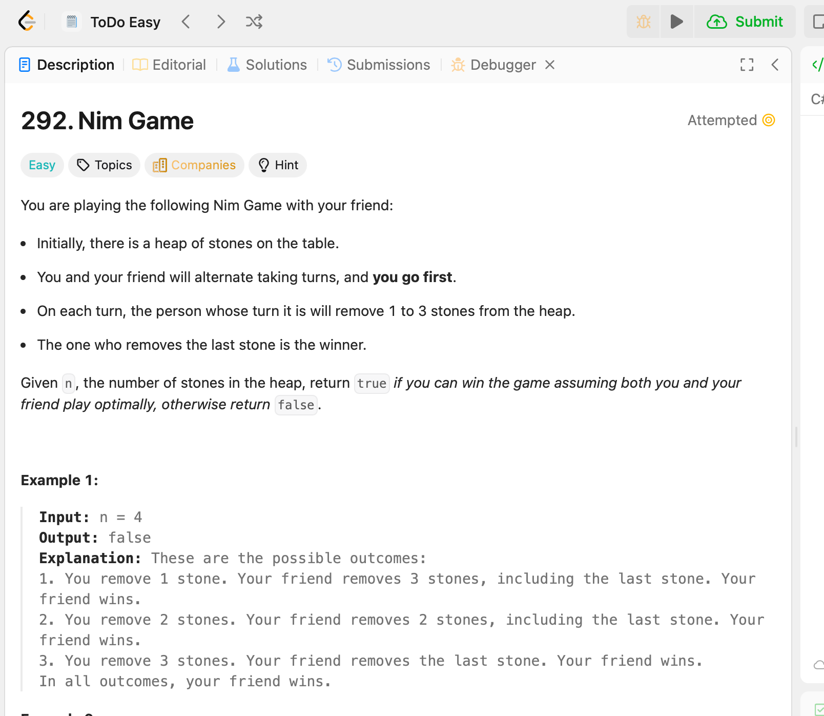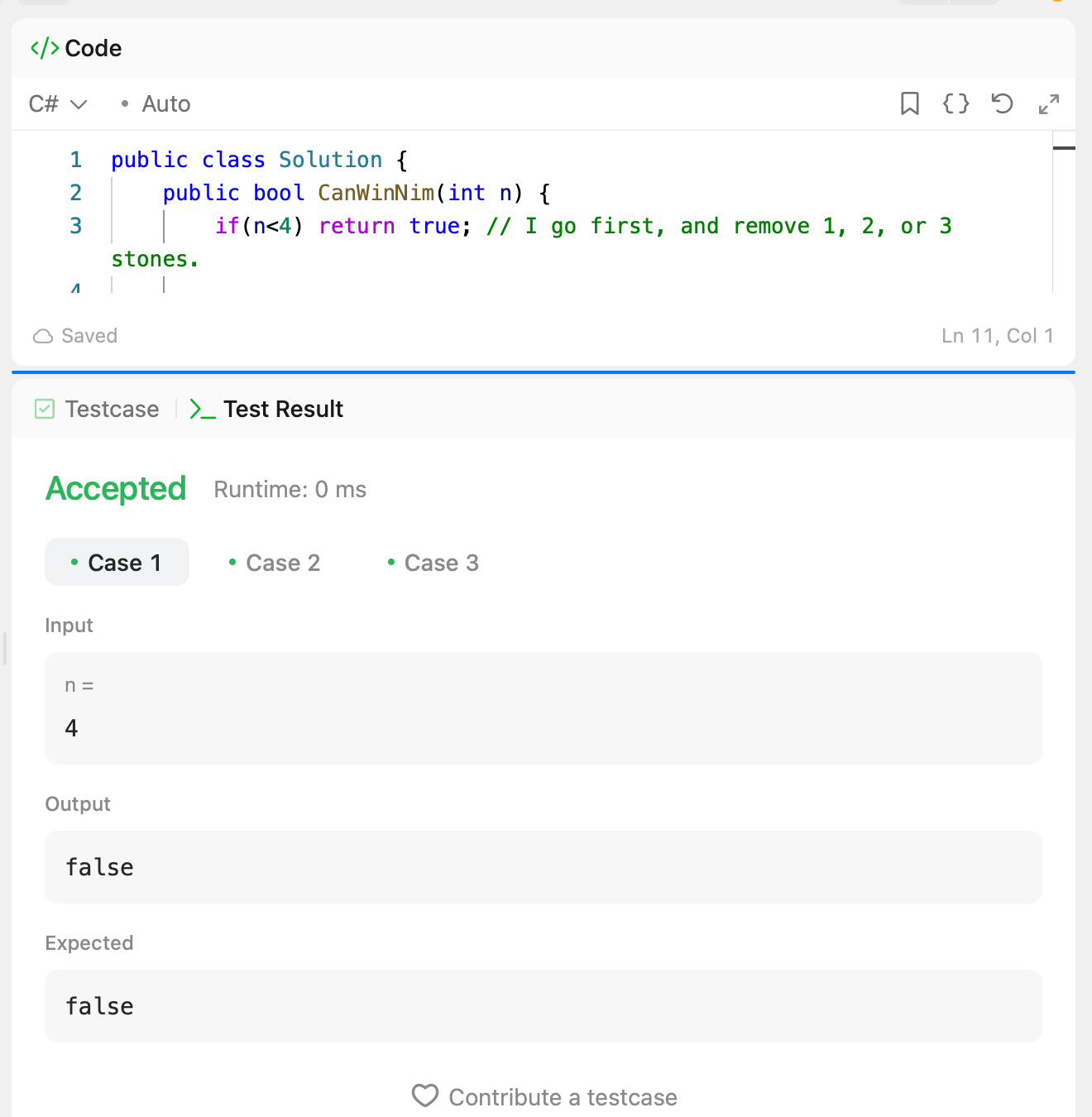 if(n<4) return true; // I go first, and remove 1, 2, or 3 stones.